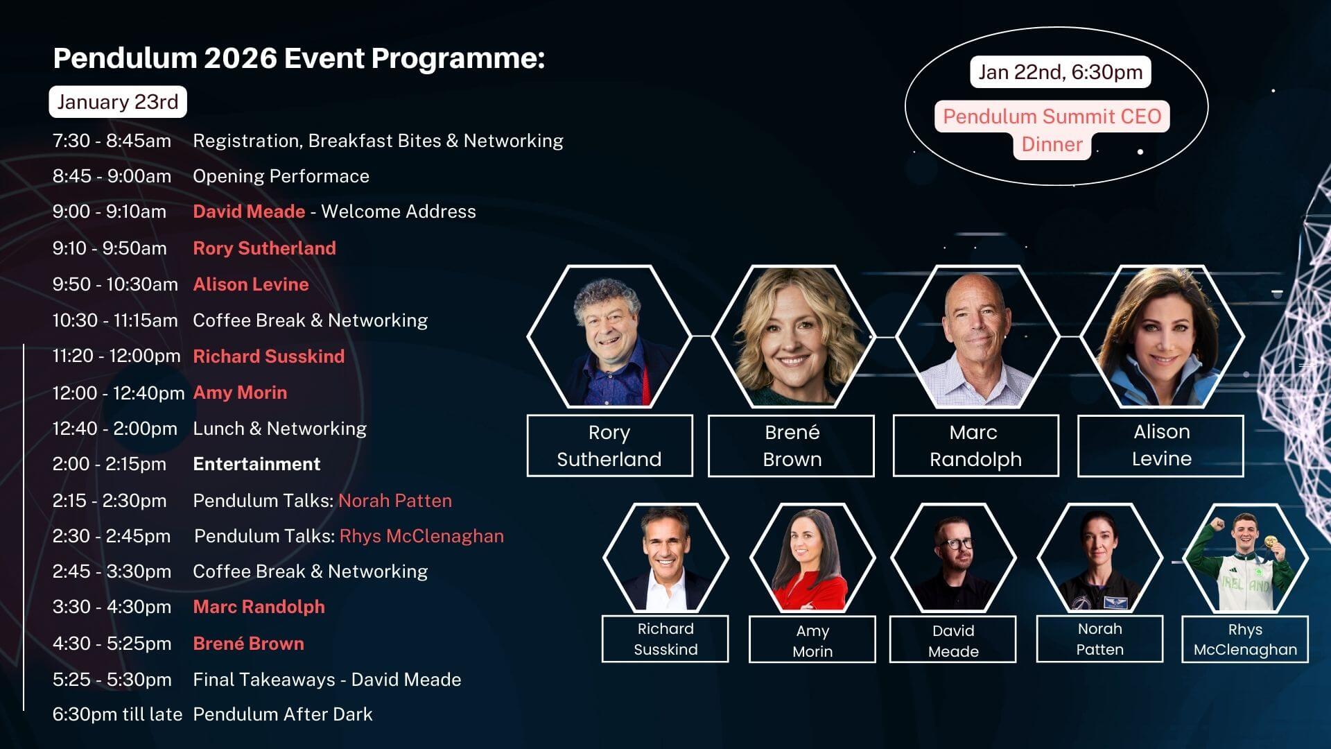 Pendulum is a vocational certified leadership programme delivered through a one day summit experience for people who want to lead and perform at a higher level. CPD accredited and designed for real world application, it gives delegates practical tools to strengthen culture, communication, resilience and decision making in an AI driven world.